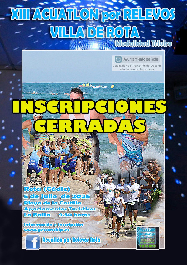 El Club Triviro con la colaboración de la Delegación de Deportes de Rota, organizan el XIII Acuatlón por Relevos Villa de Rota en la Modalidad TRIVIRO (distancia: 4 x (500m natación + 2km de carrera), los cuatro miembros del equipo realizan el recorrido completo uno detrás de otro marcando el tiempo del equipo el ultimo relevista).