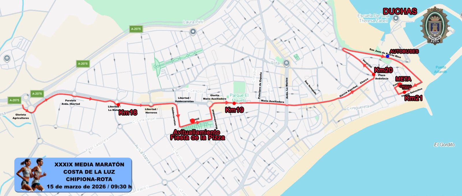 Recorrido: La distancia a recorrer será de 21.097 metros, incluyendo un recorrido urbano por Chipiona, con salida Avenida de la Constitución, frente parque Blas Infante, salida dirección Avenida los Naranjo, giro en la rotonda para volver por Avenida los Naranjos e incorporarse a la Avenida la Constitución hasta llegar al carril bici de Los Arriates, Camino de Las Tres Piedras hasta incorporación al Carril bici de la carretera A-491 a la altura del Pinar de Chipiona, entrada en Costa Ballena, recorrido de norte a sur, vuelta al Carril bici de la carretera A-491 hasta el cruce con A-2076, se sigue por dicho carril bici y a la altura del puente peatonal, paso a Vía Verde, hasta Rota, donde se finalizará con un recorrido urbano por Rota.